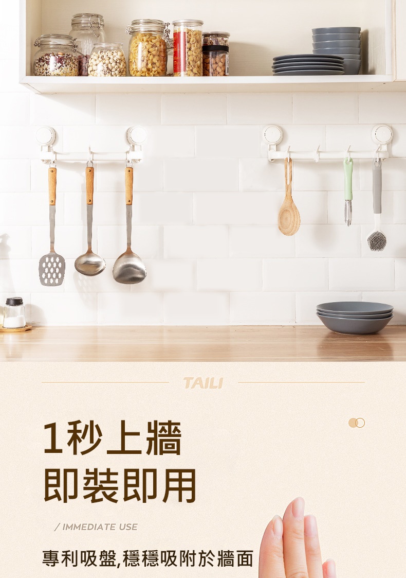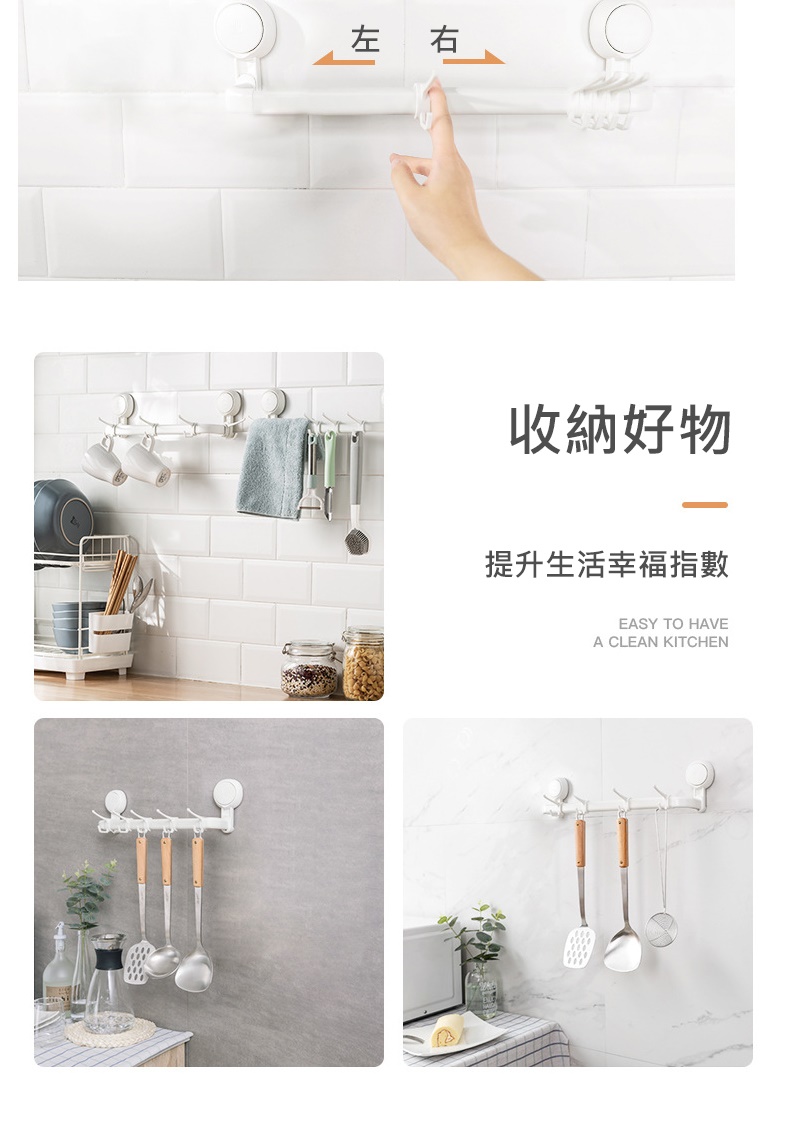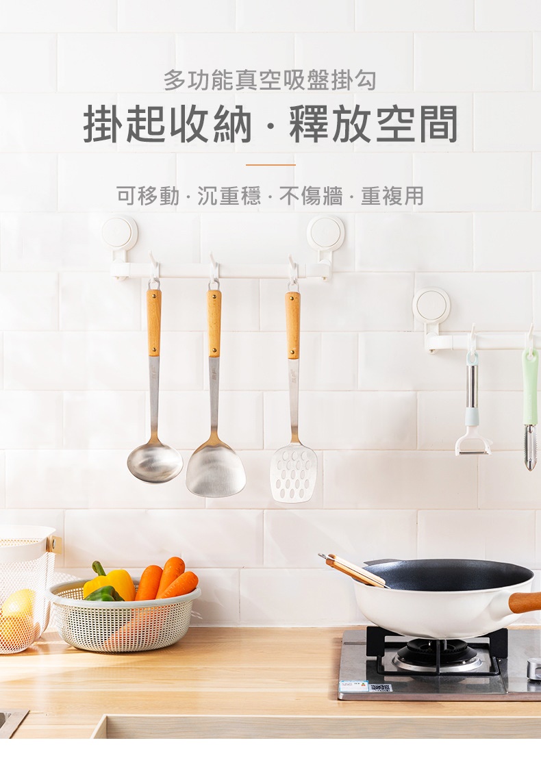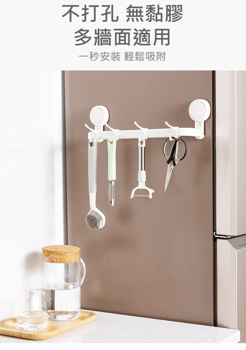 產品特色◆仿章魚吸盤設計,秒安裝穩固不掉落◆免打孔免釘免鑽,拆卸不殘膠不破壞牆面◆吸盤可隨意移轉更換位置,重複利用◆廚具懸掛收納,釋放檯面空間◆配備5掛鉤,可自由移動調節 ◆掛桿太空鋁材質,耐用不易生鏽◆與牆距離8.7cm,掛物通風易晾乾◆適用居家多場景,廚房/衛浴/玄關等掛件收納