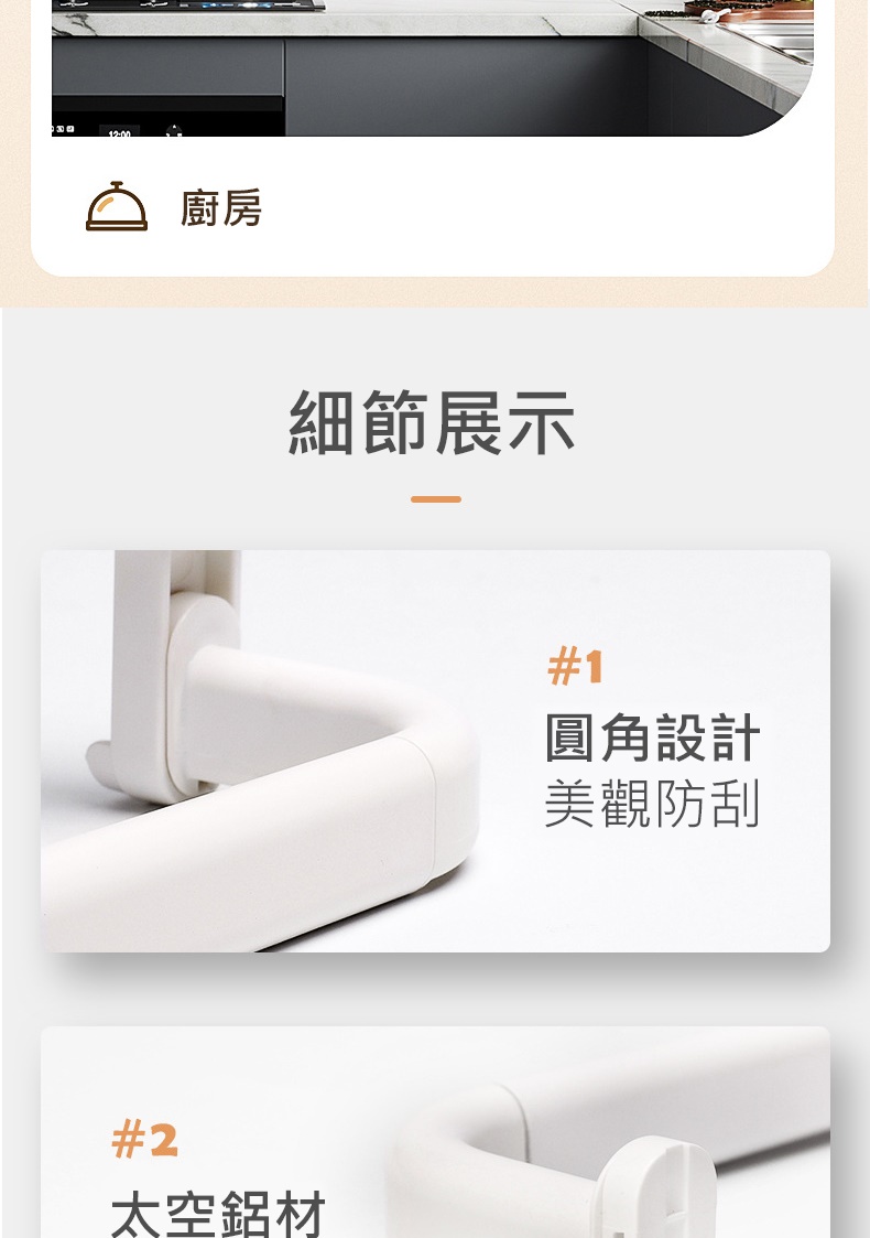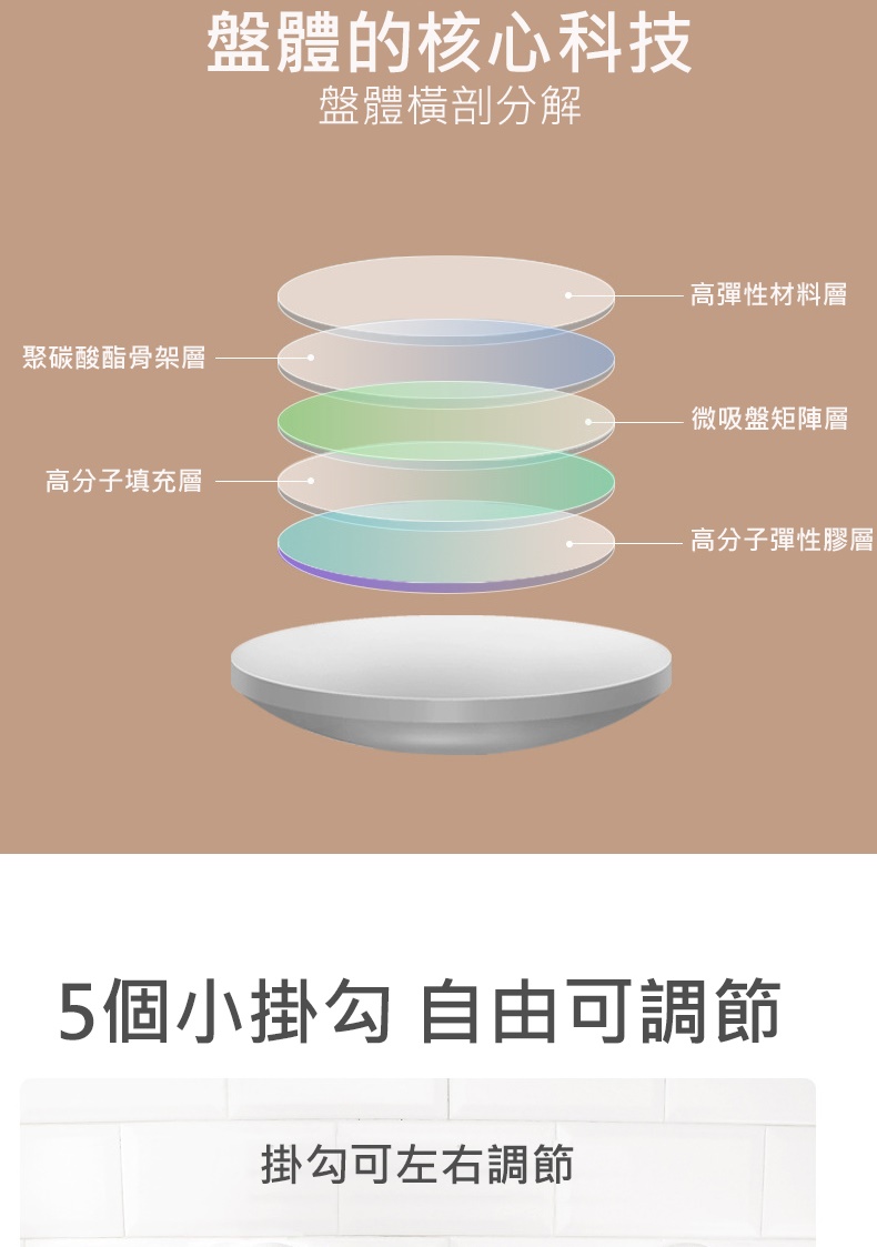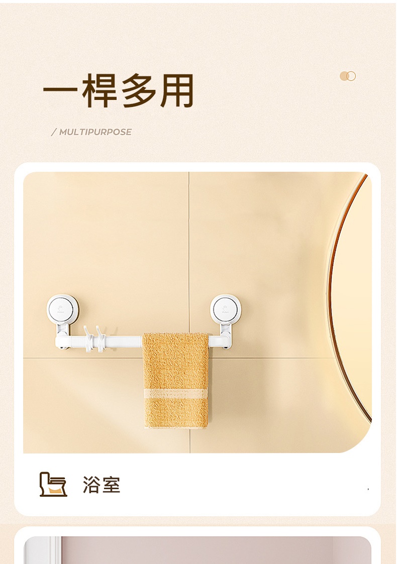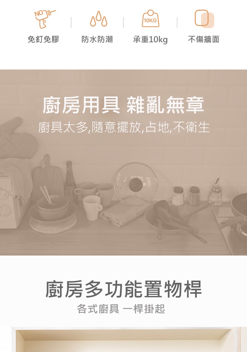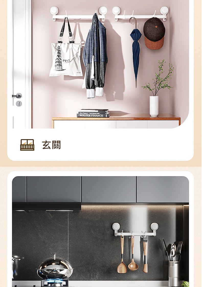 產品特色◆仿章魚吸盤設計,秒安裝穩固不掉落◆免打孔免釘免鑽,拆卸不殘膠不破壞牆面◆吸盤可隨意移轉更換位置,重複利用◆廚具懸掛收納,釋放檯面空間◆配備5掛鉤,可自由移動調節 ◆掛桿太空鋁材質,耐用不易生鏽◆與牆距離8.7cm,掛物通風易晾乾◆適用居家多場景,廚房/衛浴/玄關等掛件收納
