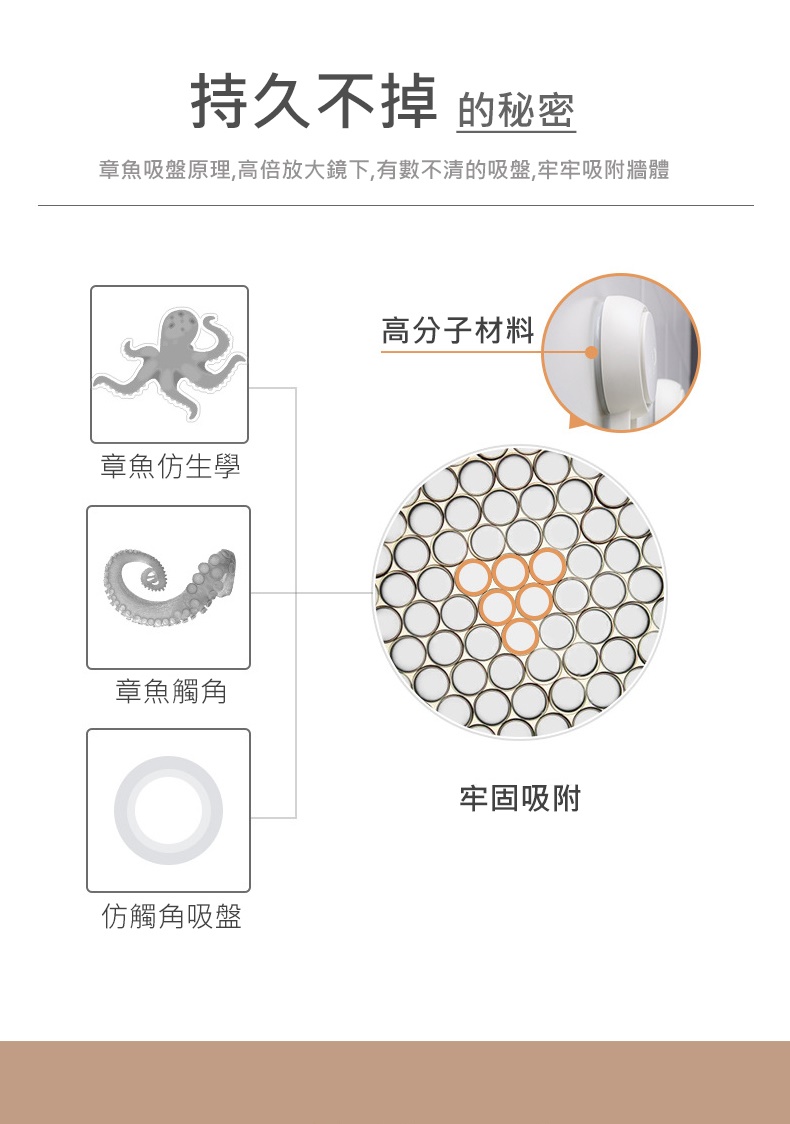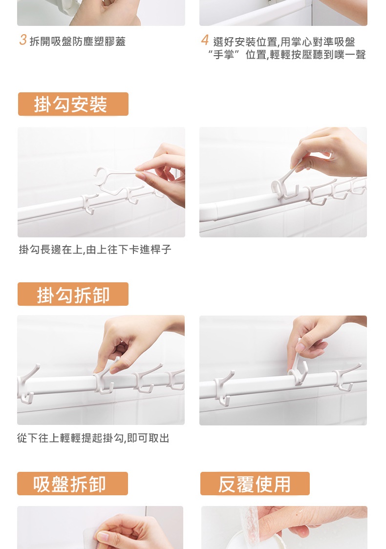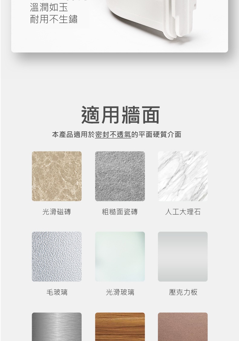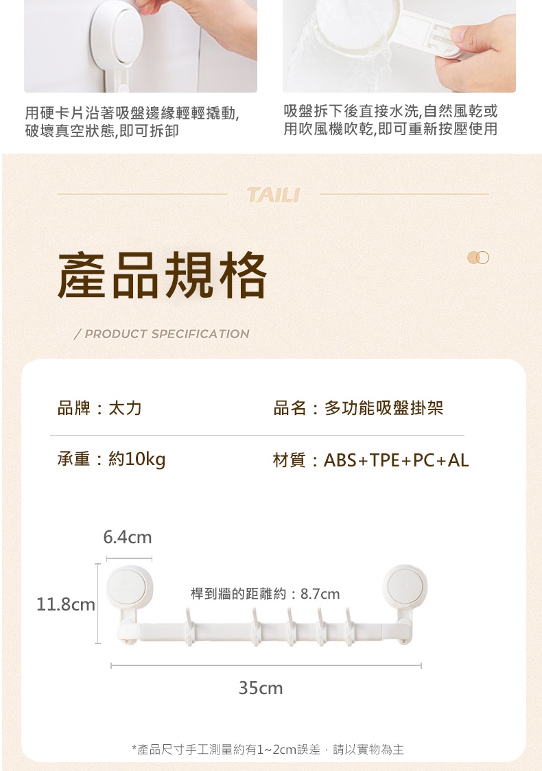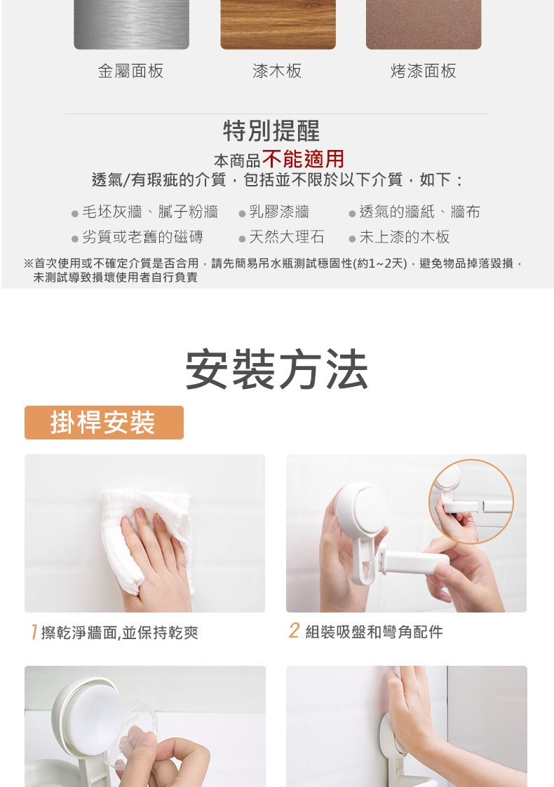 安裝注意事項1.請依照包裝說明步驟安裝使用。2.本產品適用於密封不透氣的平面硬質牆面,首次使用或不確定牆面是否合用,請先簡易吊水瓶測試穩固性(約1~2天),避免物品掉落毀損,未測試導致損壞使用者自行負責。3.荷重約10kg勿超出荷重限制使用,勿吊掛易碎物、貴重物或危險物品,建議不要長期掛重物,若因超載導致物品摔落,使用者自行負責。