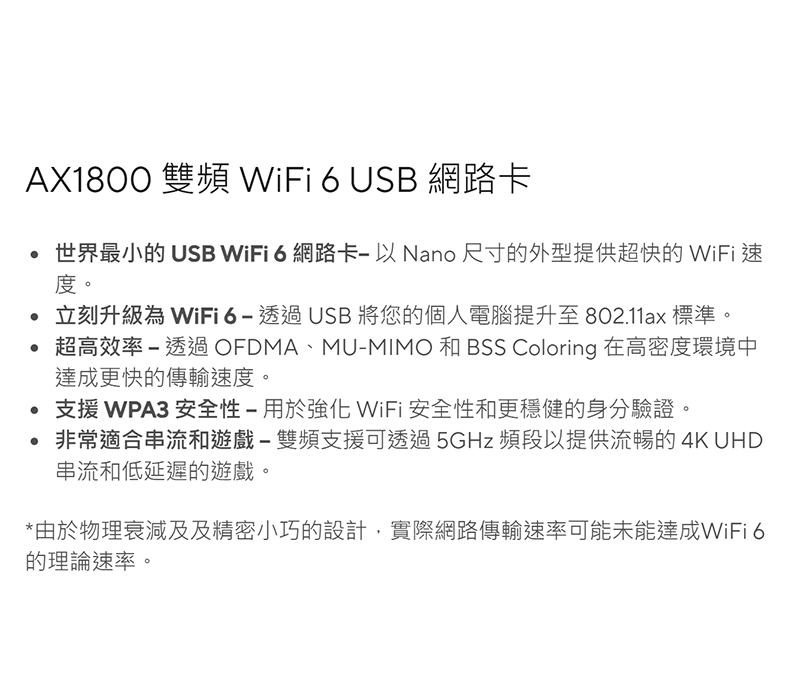 1.世界最小的 USB WiFi 6 網路卡– 以 Nano 尺寸的外型提供超快的 WiFi 速度。