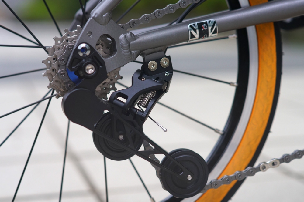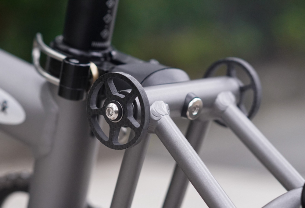 目前最接近這重量的折疊車款,就是一樣都採用碳纖前叉的 brompton T Line,其單速版本的車重是 7.45kg!要讓一輛標準尺寸的折疊車達到這樣的重量...說真的是...「超級困難!」