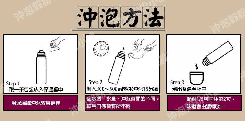 <熱泡>建議以保溫瓶沖泡約400c.c.-500c.c.熱水,放置5-10分鐘後即可飲用。沖泡濃度及回沖次數可依各人喜好調整。